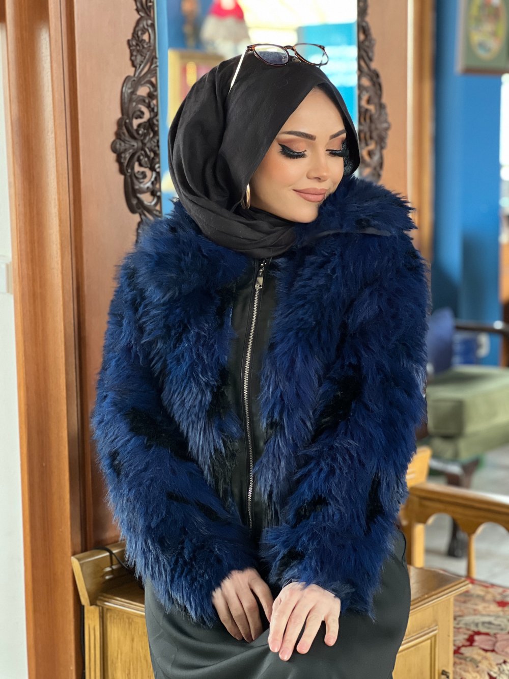 Üst: Klasik yaka , önden fermuarlı , içi astarlı kürk mont .