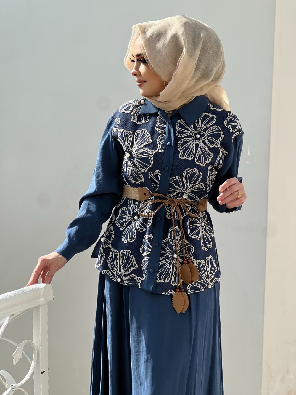 GAZZELLA İNCİ İŞLEMELİ CUPRA ETEKLİ TAKIM Mavi