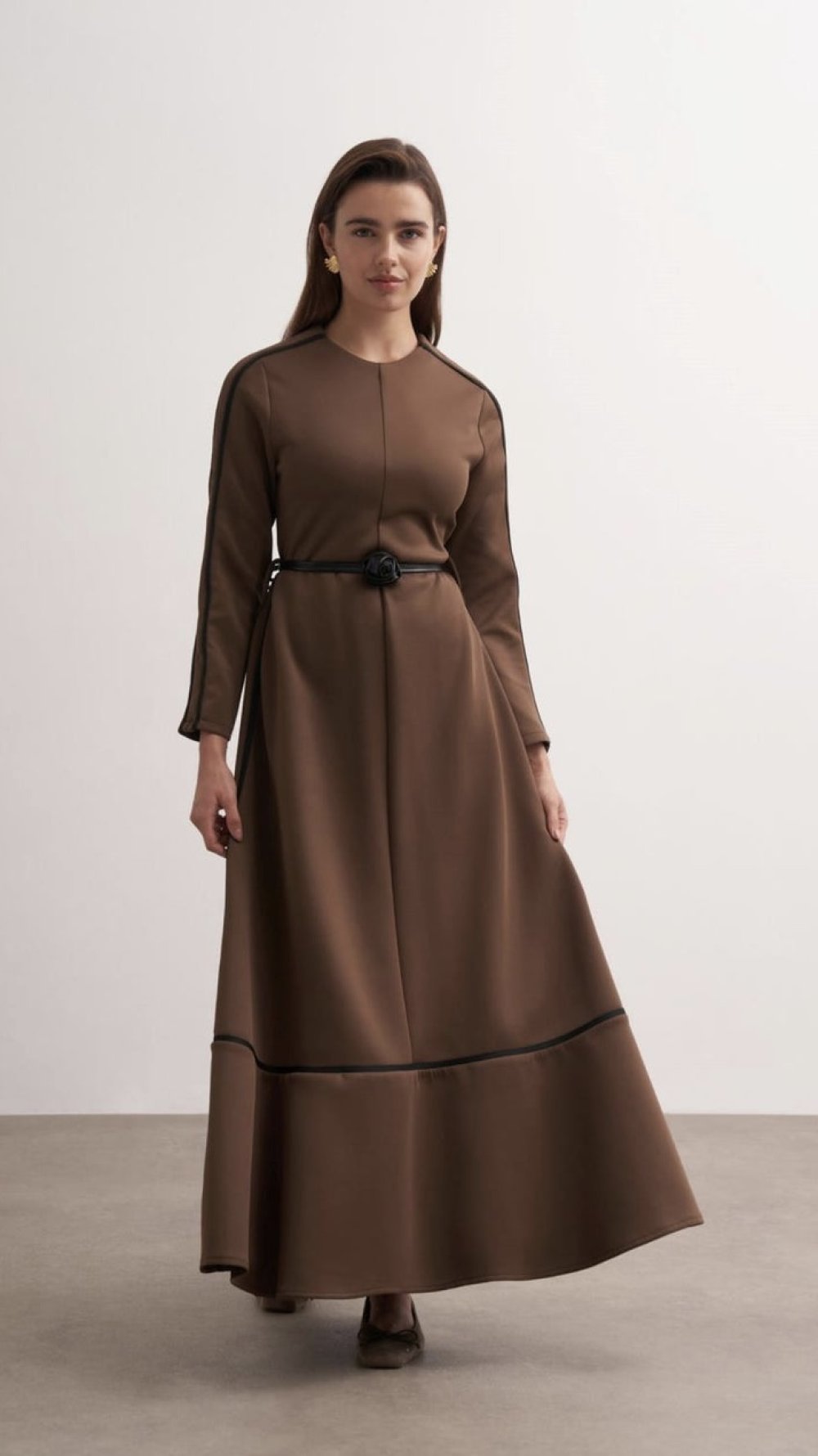 Elbise scuba kumaştan üretilmiştir. Biyeleri mevcut, gül kusaş ürüne dahirdir. Arka kısmı fermuarlıdır.