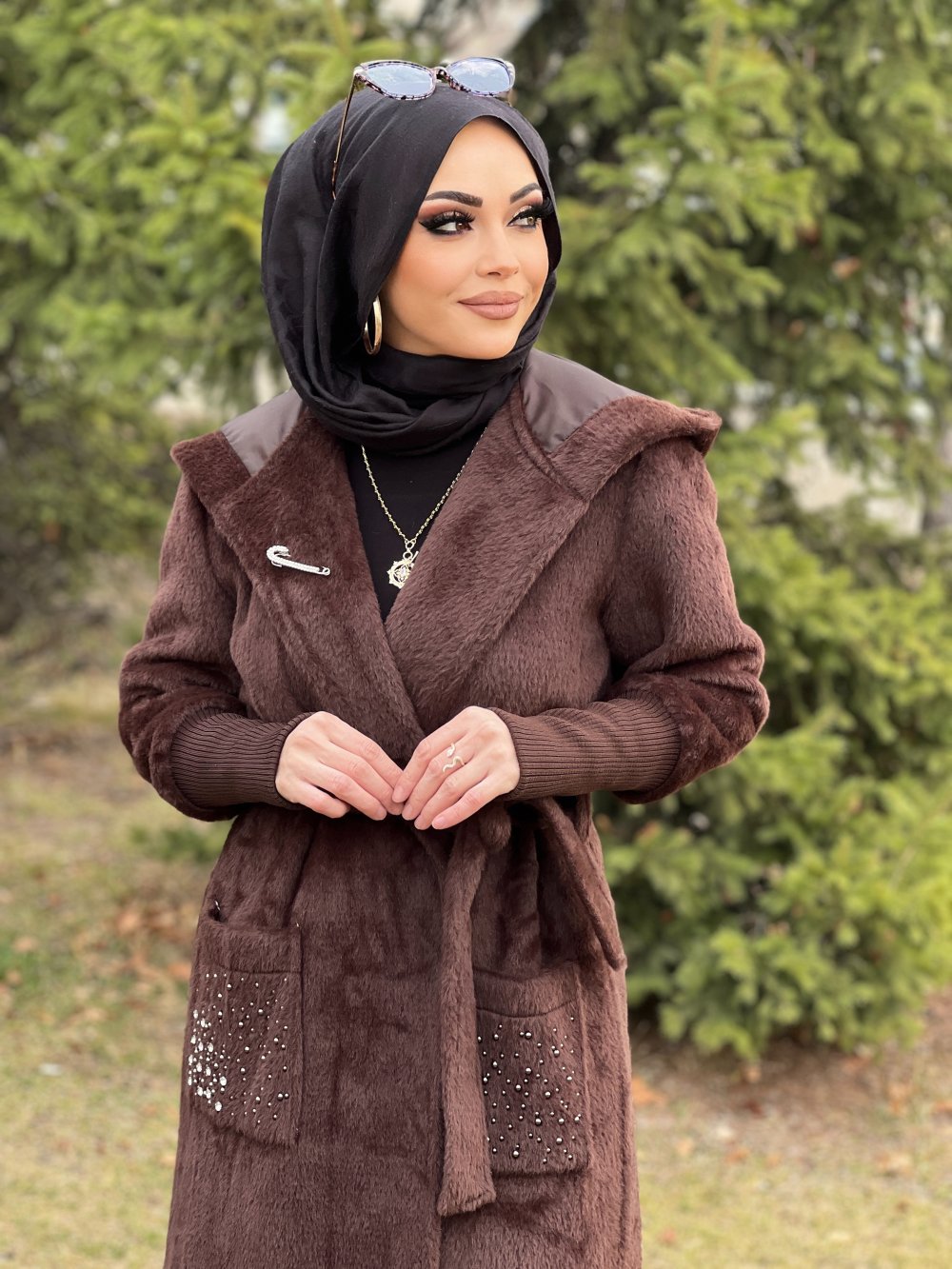 KAPÜŞONLU ANGORA KABAN Kahverengi