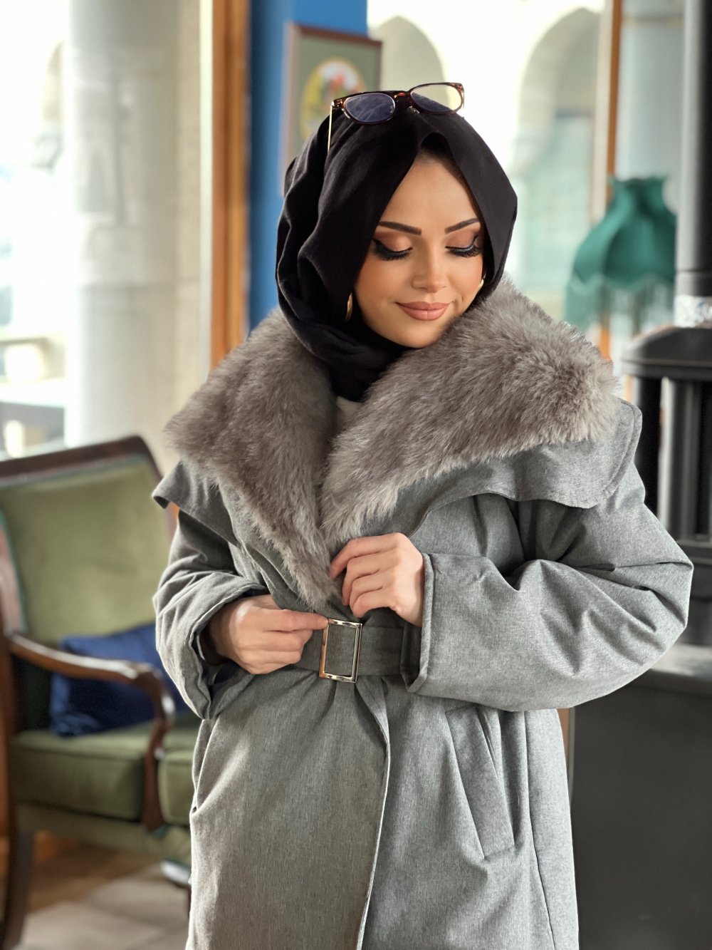 KÜRK YAKALI KUŞAKLI MONT Gri