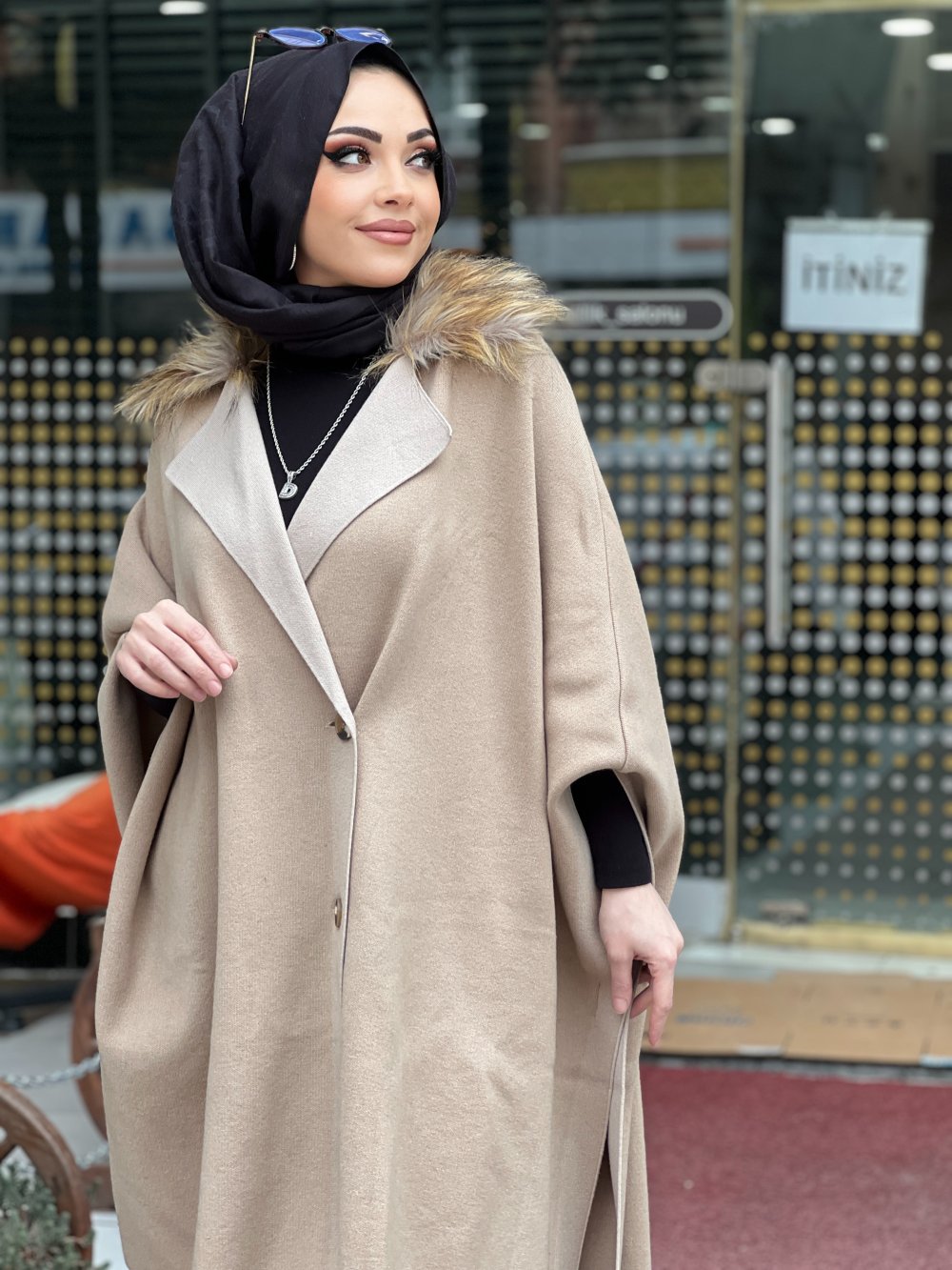 YAKASI KÜRKLÜ DÖRT DÜĞMELİ PANÇO Bej